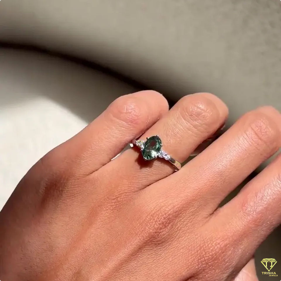 Oval Moissanite Engagement Ring with Green Sapphire Accents Vintage-Inspired Delicate Ring, Perfect Anniversary Gift