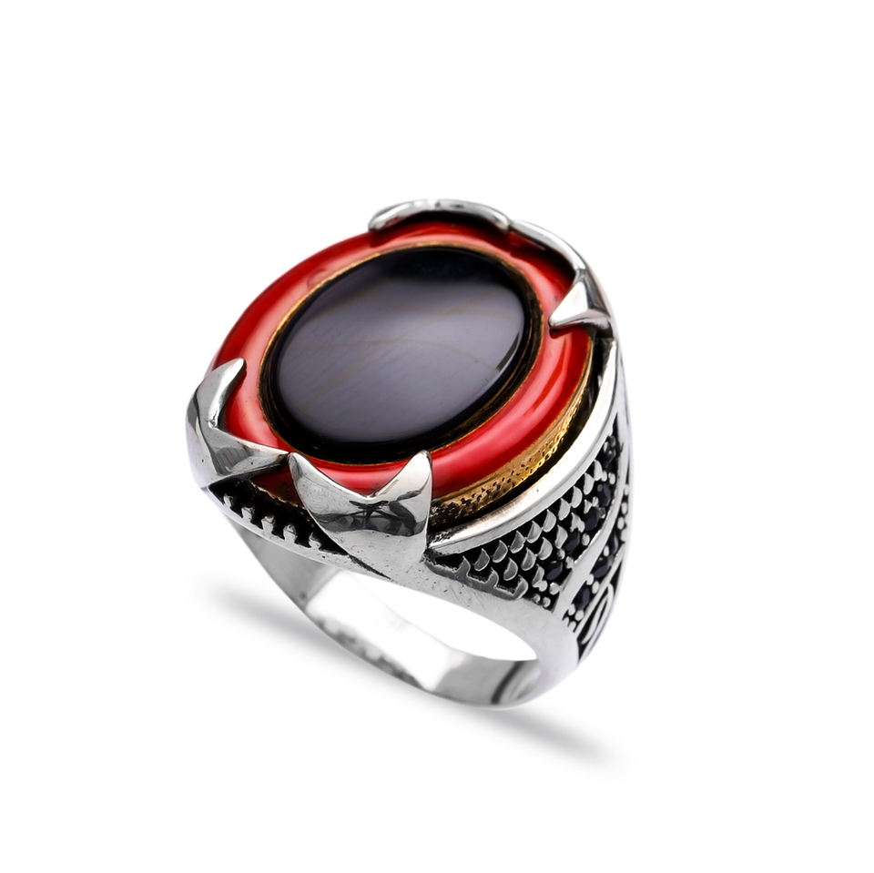 Oval Onyx Stone Red Design Ottoman Men's Ring Turkish Handmade Wholesale Authentic Silver Men Ring