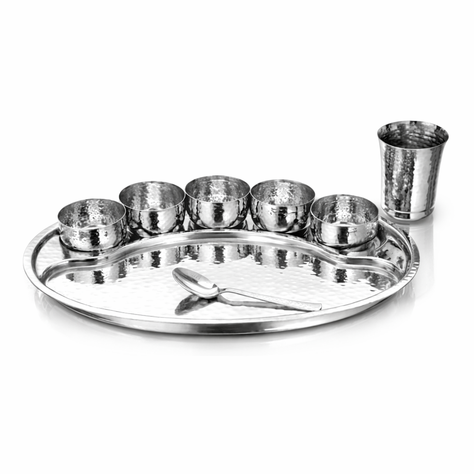 Oval Thali Set 8 Pcs Single Wall Hammered with Silver Color Mirror Polished Wholesale Sovereign Thali Set 9 Pcs Set