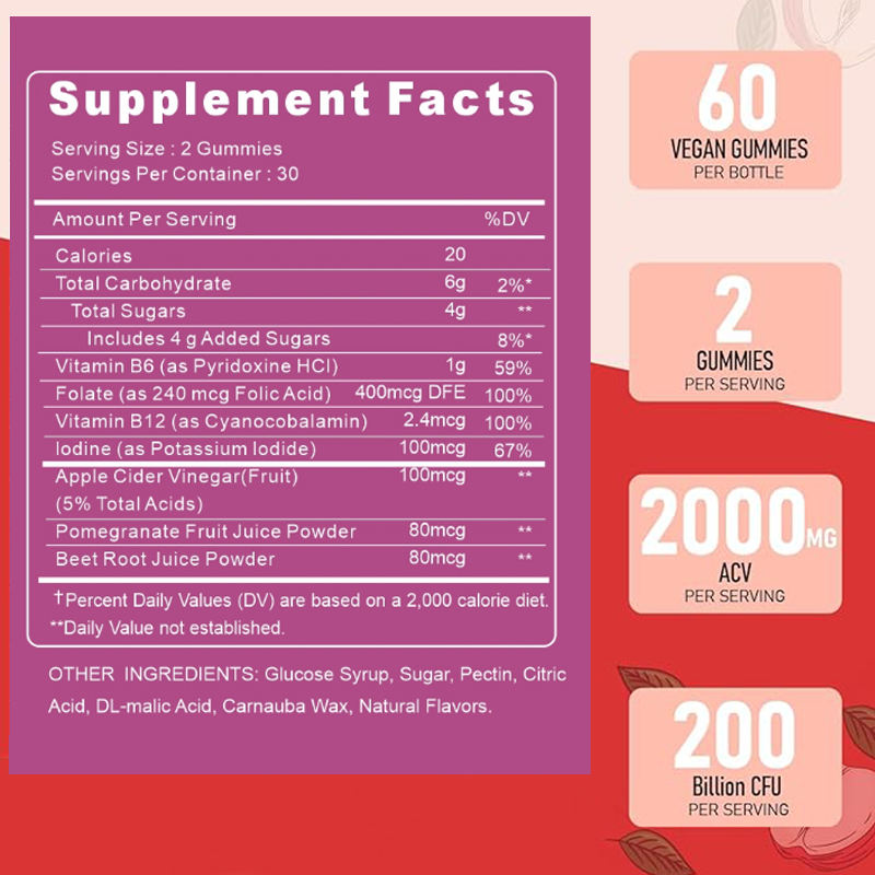 Main Ingredient:Vitamin B6 B12, Folate & Iodine, Apple Cider Vinegar, Pomegranate Juice Powder & Beet Root Juice Powder