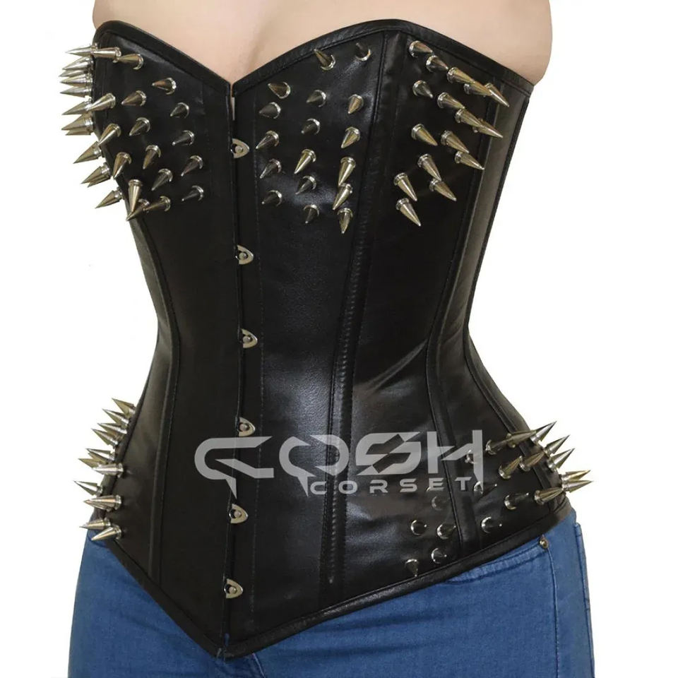 Overbust Steelboned Black Leather Corset With Spikes Decoration