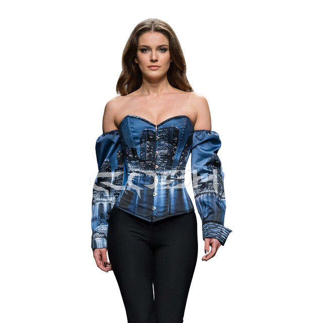 Overbust Sublimated Blue Satin Wholesale Custom Printed Corset Top with Sleeves Urban Skyline Bustier Manufacturer