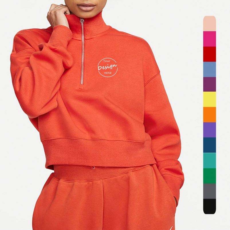 Oversize Custom Logo Wholesale Sweatshirt Orange Drop Shoulder Plain Pullover Plus Size Fleece Cropped Half Zip Hoodie for Women