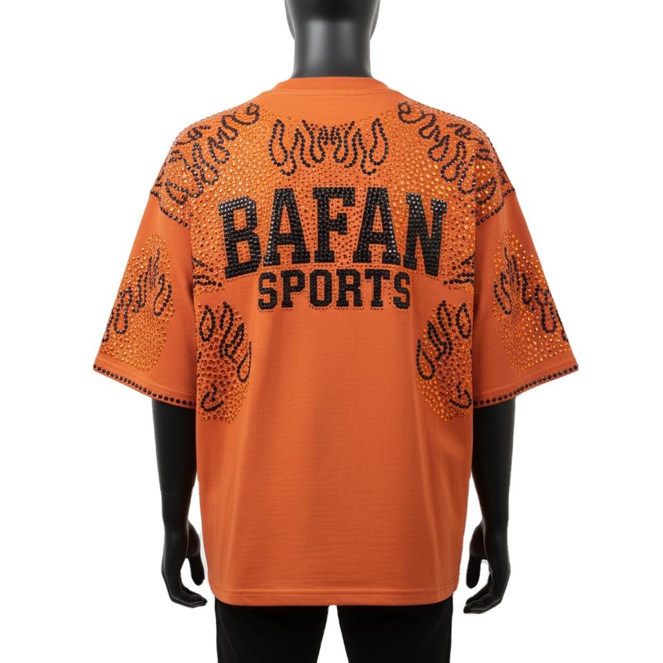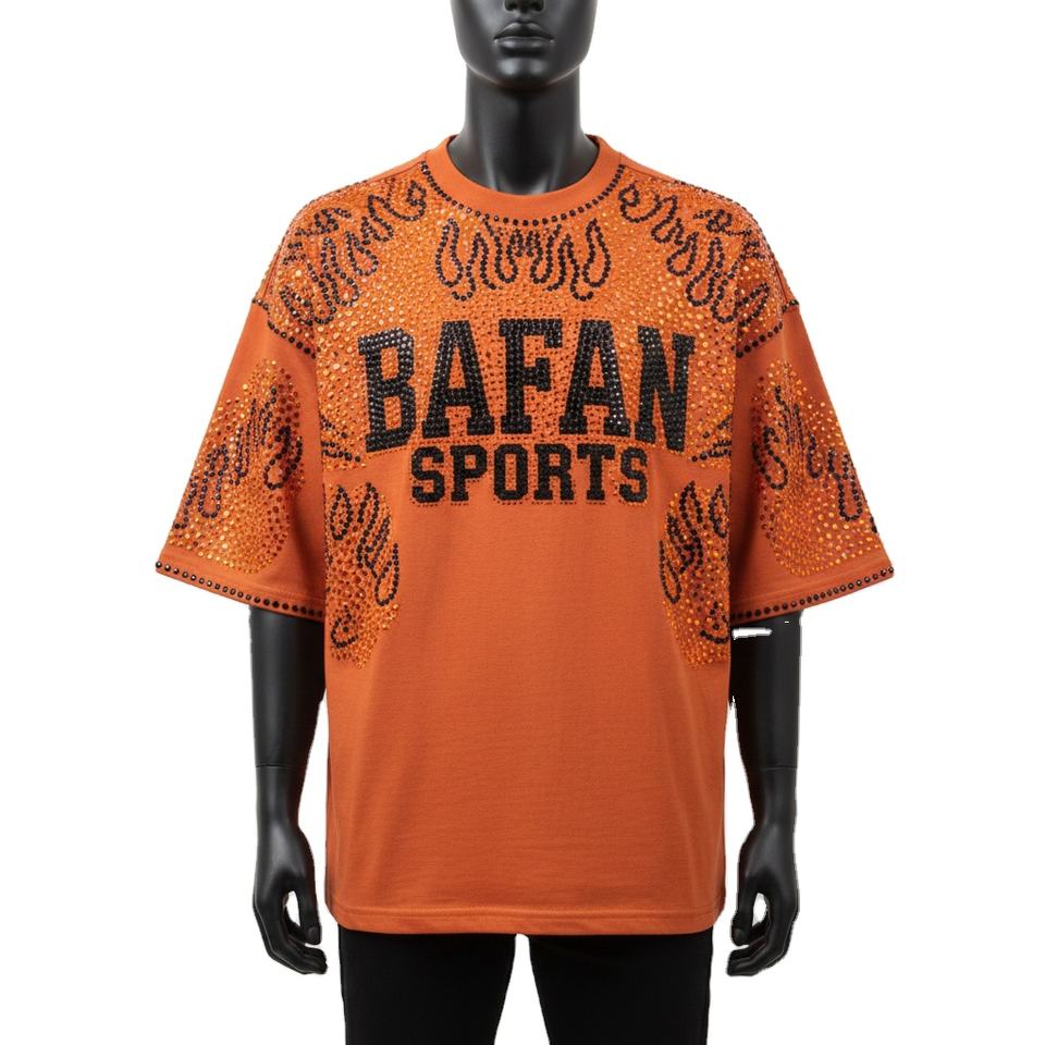 Oversized Men Boxy TShirt Cotton Jersey Orange Crystal Stud Flame Design Logo Top 100% cotton T-shirt for men loose fit printed