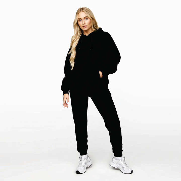 Oversized Slouchy Fit High Waisted 80% Cotton 20% Polyester Linear Arch Hood & Jogger Black Womens Tracksuit