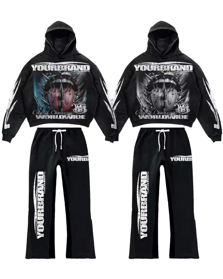 Oversized Vintage Acid Wash Full Cotton Tracksuit Set Featuring Custom DTG Hoodie and Flared Sweatpants for American Streetwear