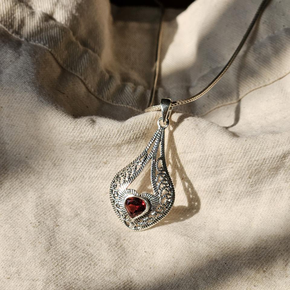 Oxidized 925 Sterling Silver Lovers Shape Religious Style Filigree Design Garnet Heart Charm Pendants Extreme Quality All