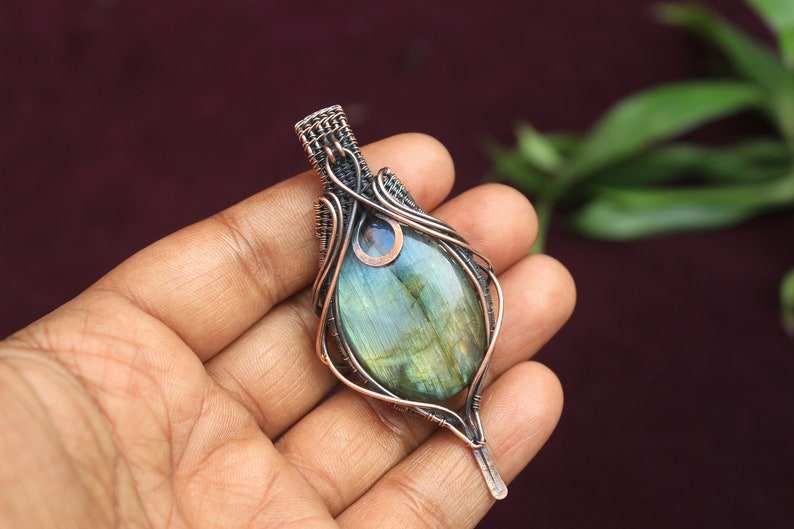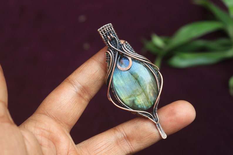 Oxidized Copper Wire Wrapped Fire Labradorite Pendant Handmade Gemstone Jewelry Elegant Necklace for Her