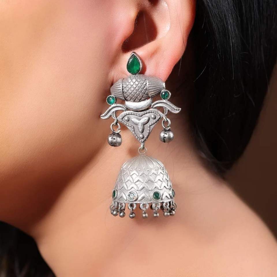 Oxidized Silver Green Stone Jhumka Earrings Traditional Indian Jewelry Gift for her
