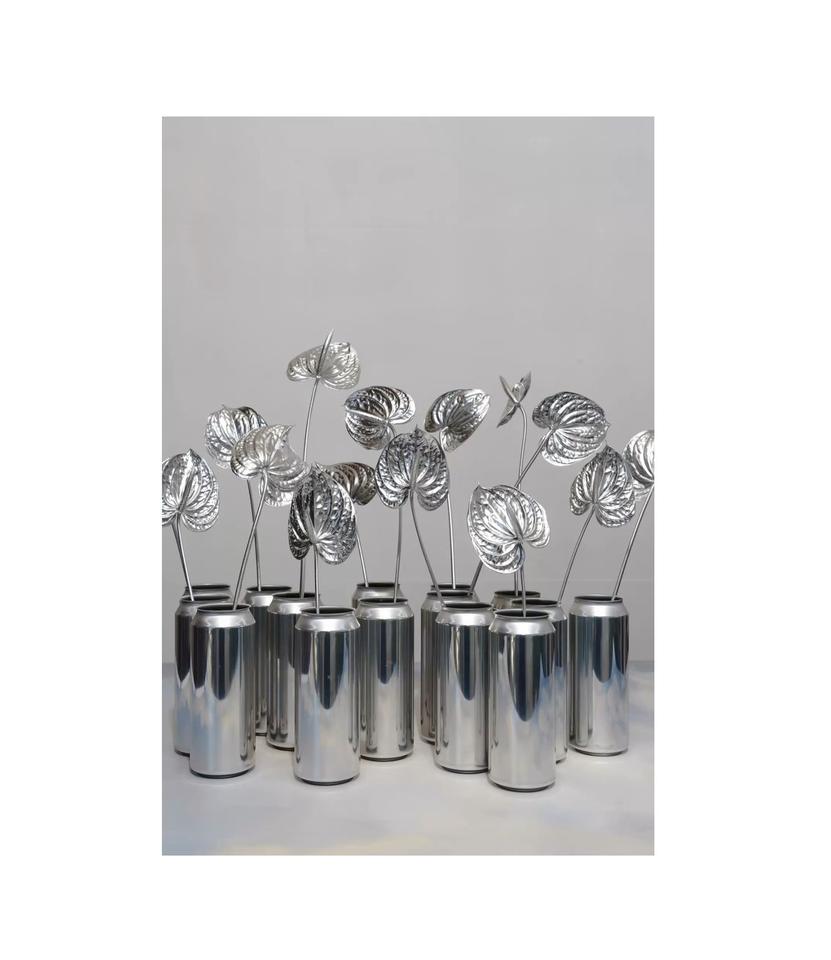 Oxidized metal flower vase with rustic appeal and unique form designed for countryside home or artistic interiors