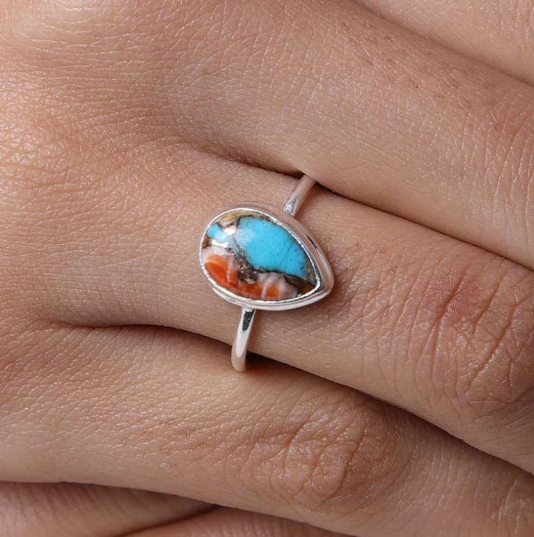 Oyster Copper Turquoise Gemstone Ring for Girls 925 Sterling Silver Pear Shape Bezel Setting for Parties