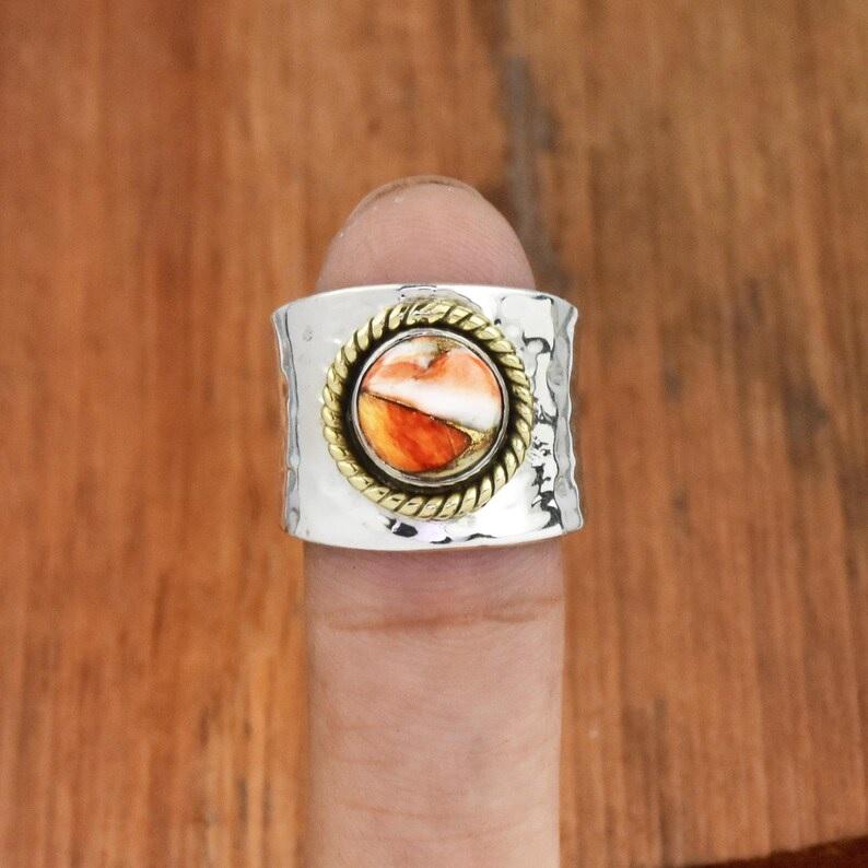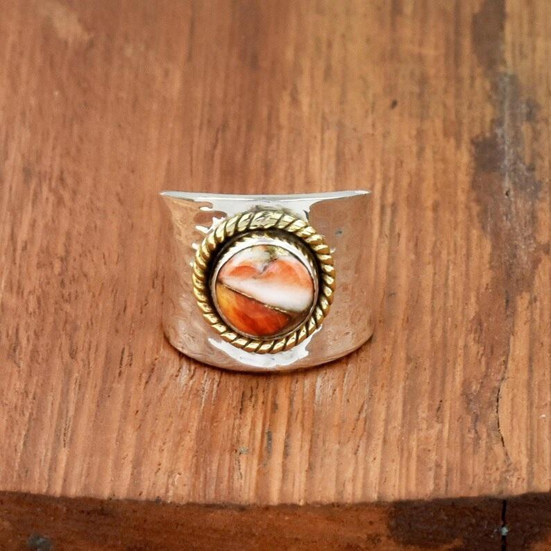 Oyster Copper Turquoise Ring with Round Gemstone and Hammered Wide Band in Sterling Silver