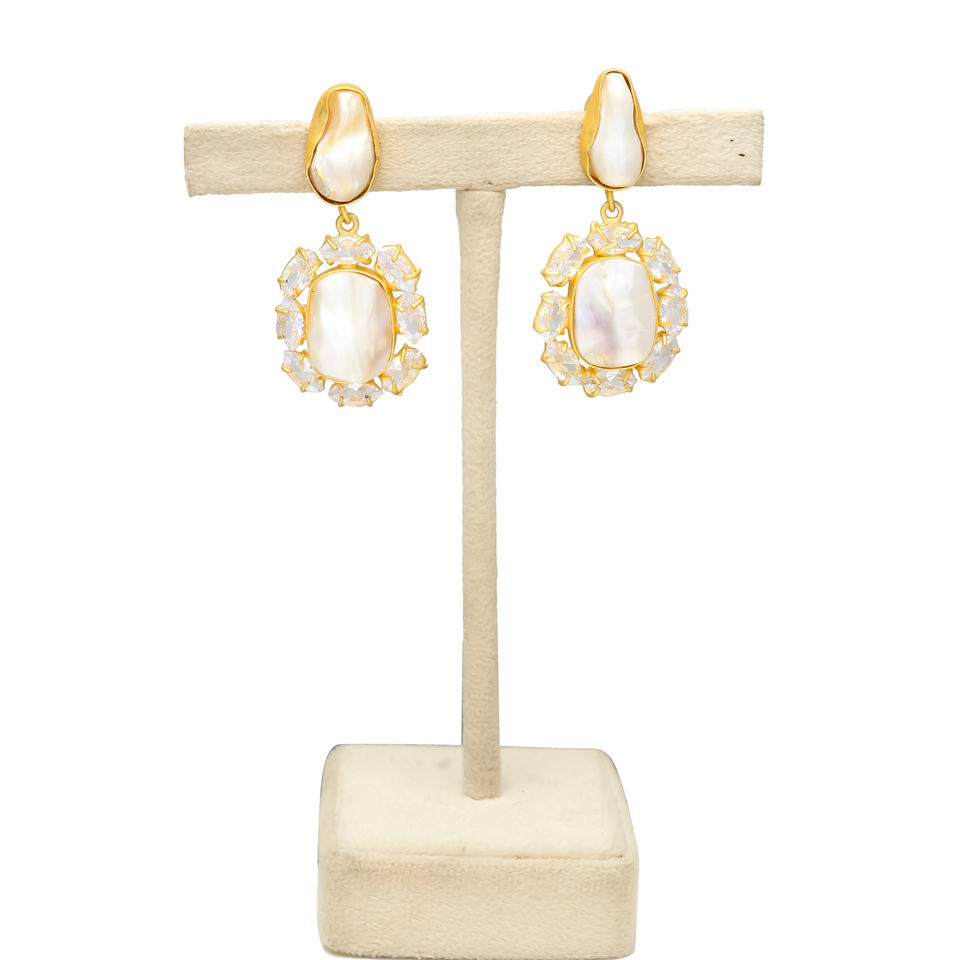 Oyster White Natural Freshwater Pearl Long Brass Gold Plated Earring Handmade Statement for Women Cubic Zirconia Main Brass