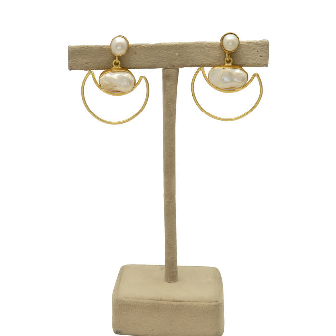 Oyster White Natural Freshwater Pearl Moon Shape Vintage Christian Stud Earrings Brass 24K Gold Plated Handmade Statement Women
