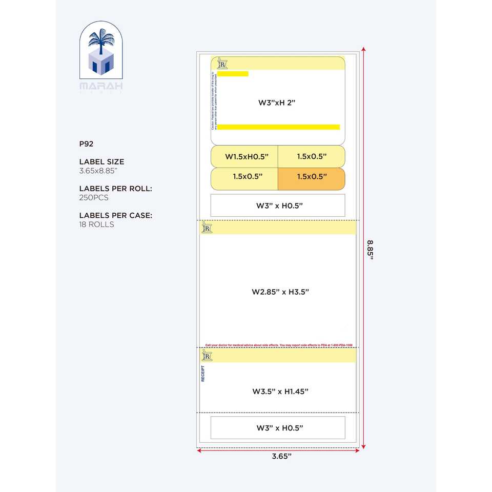Marah P90 Blank Prescription Labels 3.65'' x 8.85'' RX-Direct Thermal White/Yellow Background Reusable Adhesive 250 Pcs/Roll