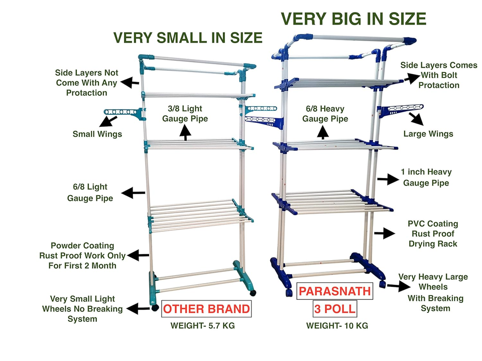 PARASNATH 3-Pole Steel Red Cloth Drying Stand Multiple Folding Arms with Castor Wheels Brake Epoxy Coated Pipes for Balcony Use