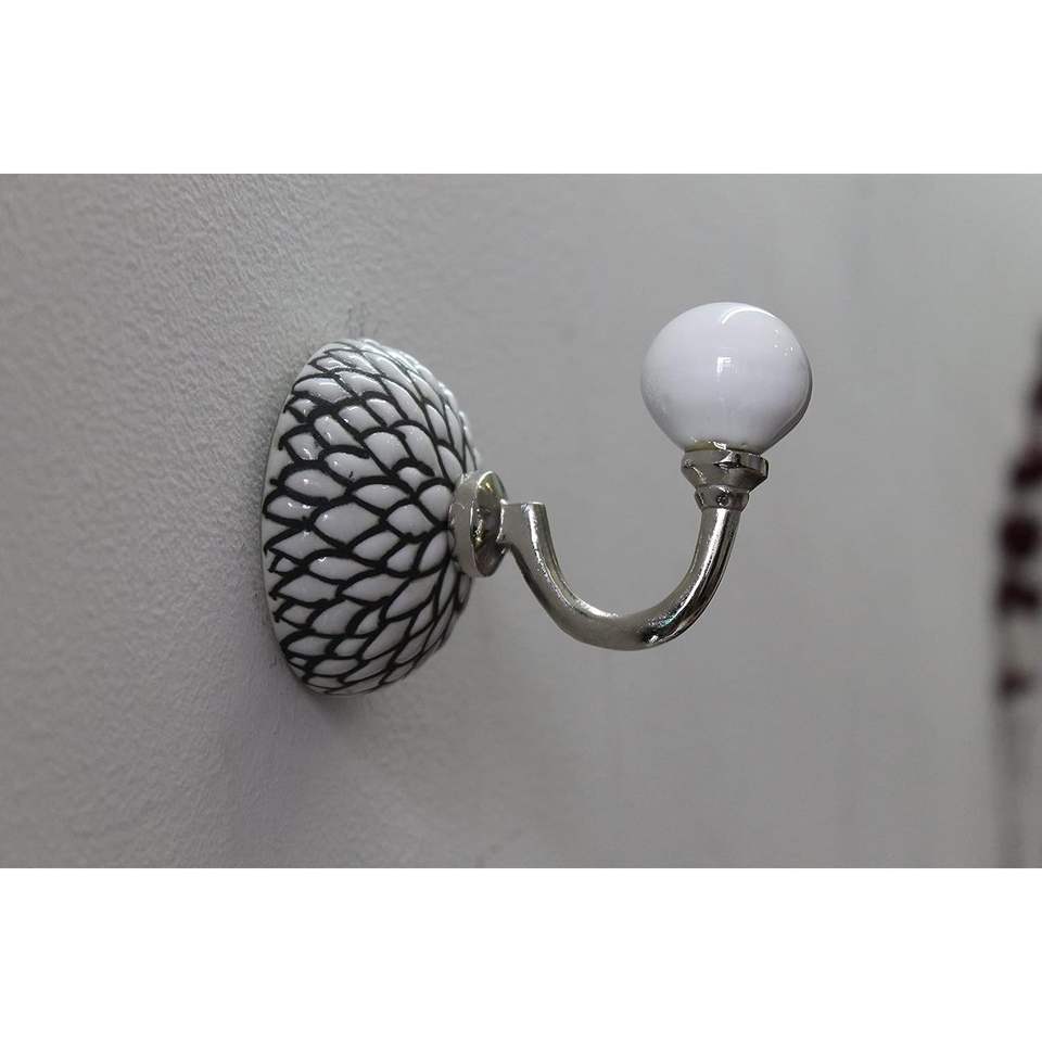 PARIJAT HANDICRAFT Black and White Floral Ceramic Wall Hook Hanger Hand Painted Key Holder Hat Clothes Bath Towel Hangings