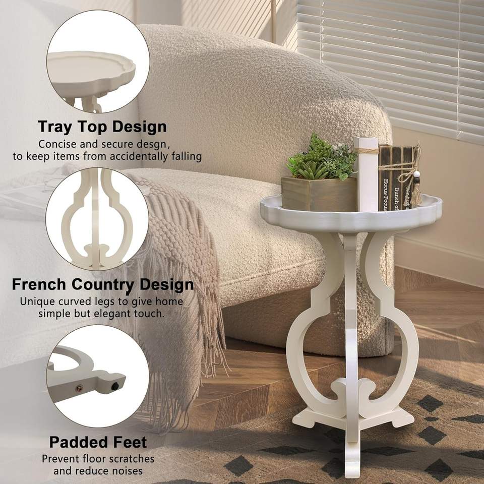 PARISLOFT French Country End Table Cream White Scalloped Edge Tray Top Curved Legs Wood Living Room Accent Table