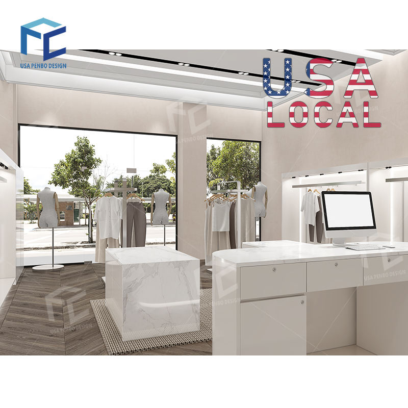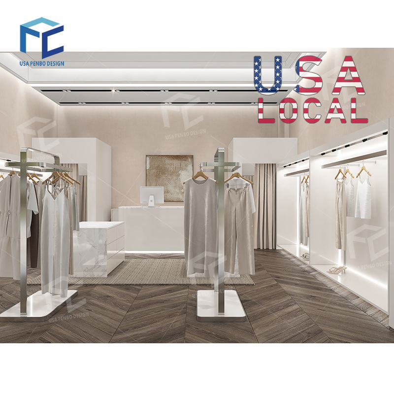 PENBO Modern Customized Ladies Dress Display Rack with Wood/Metal/Glass for Garment Shop Fitting Design Decoration