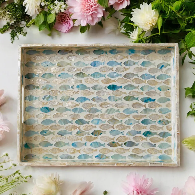 PERFECT ENTERPRISES Rectangular Wooden Serving Tray Inlay Nacre Ottoman Tray with Handles, Tea tray, Cocktail Tray