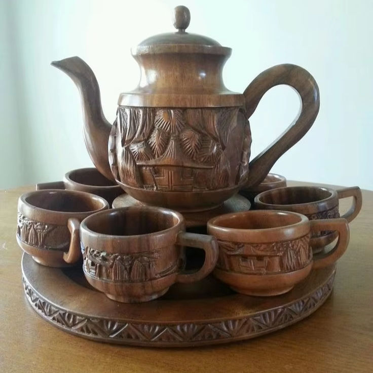 PERSONALIZED Nordic Style Coco Palm Wooden Tea Set with Pot and Tray Custom logo Coconut Wood Teapot and Cup Sets