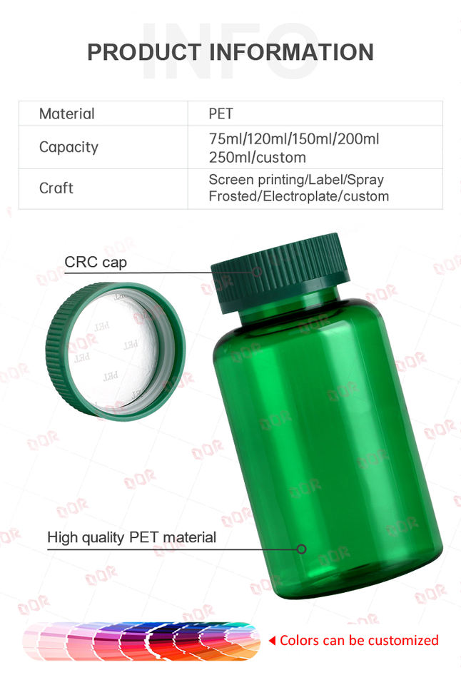 PET Quality Food Grade Green Plastic Bottle 75ml with Colour Customization and Customize Child Resistant Metallic Cap Screw Cap