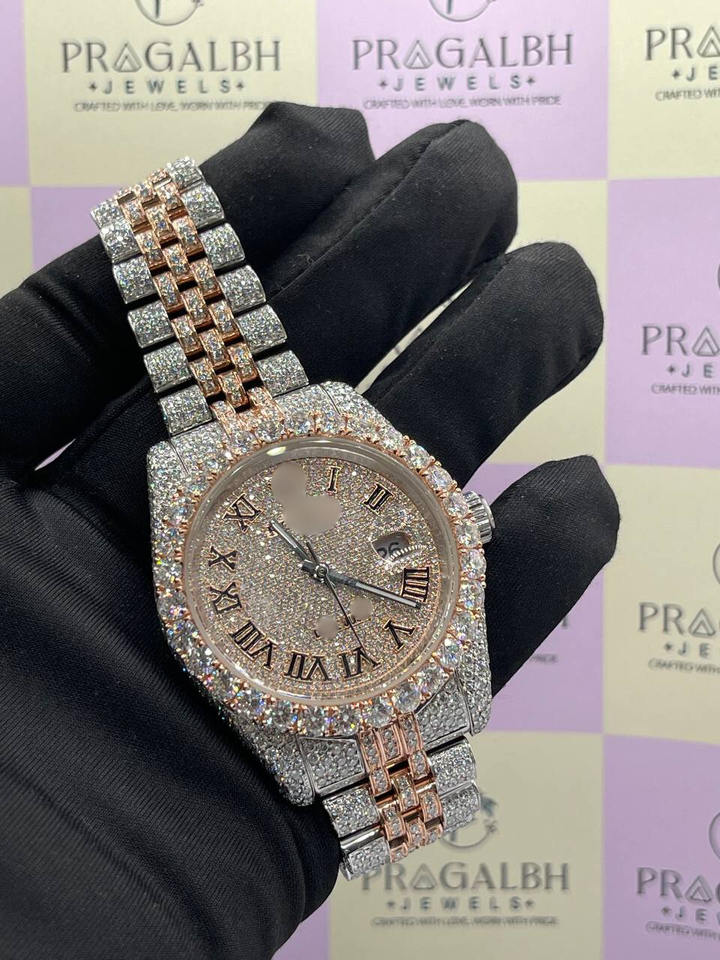 PJ Mens Luxury Iced Out Quartz Watch Two Tone Rose Gold Full Diamond Roman Numerals Jubilee Bracelet Bling Custom Logo
