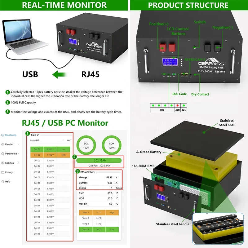 PL UA STOCK 10Year Warranty 6000 Cycles 51.2V 15Kwh Akku Solar Inverter Lithium Energy Storage Battery 48V 300Ah LiFePO4 Battery