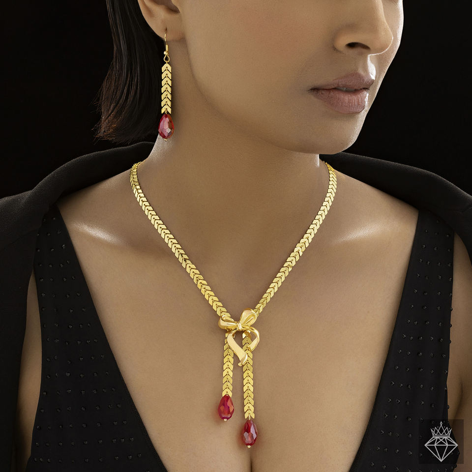 PRAO Handmade Women's Fashion Jewelry Sets Y-Necklace with Red Crystal Beads Leaf Chain Bow Detailing Anti-Tarnish Bulk Product