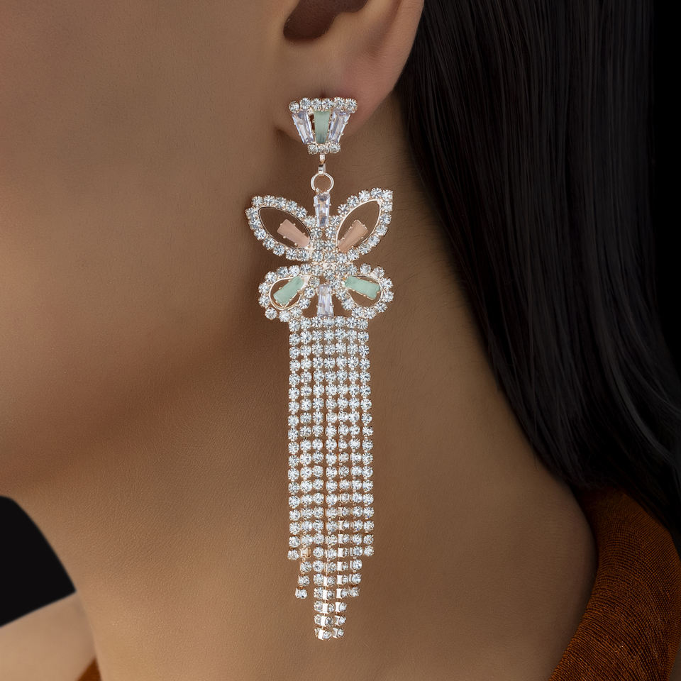 PRAO Mint Pink Handmade Anti-Tarnish Rhinestone Butterfly Long Dangle Earrings Bulk Fashion Jewellery for Women Baguette Stone