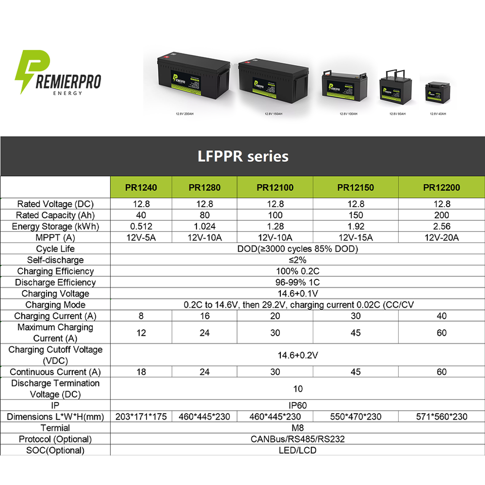 PREMIERPRO 12V 24V 50Ah 100Ah 200Ah 400Ah Lithium Iron Phosphate Battery Pack BMS LiFePO4 Power Supply Home Energy Storage Batte