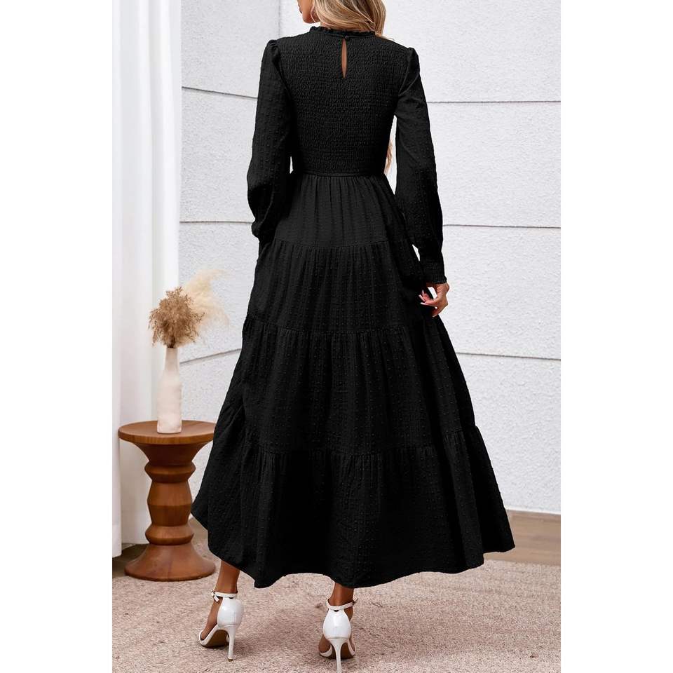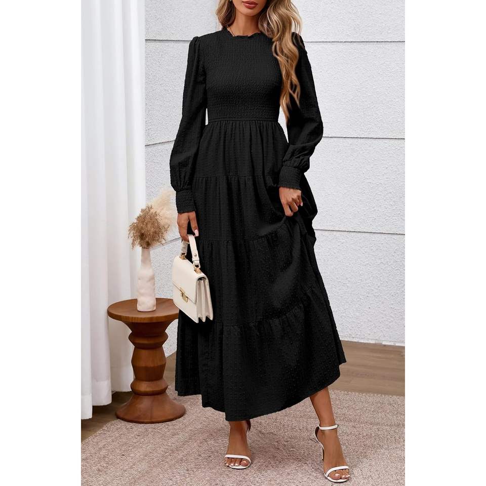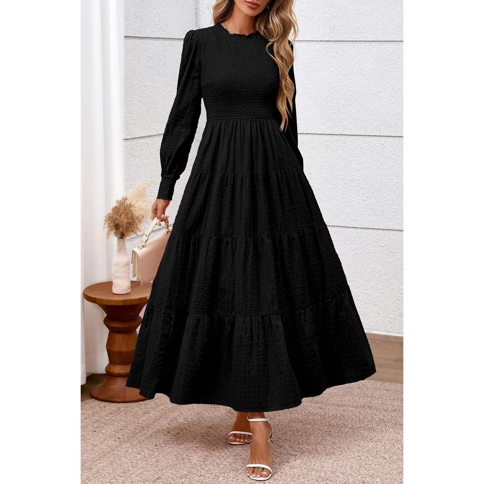Custom 2025 Fall Women's Casual Evening Dress Long Sleeve Maxi Smocked Trim Neck for Swiss Dot Tiered Flowy for Wedding