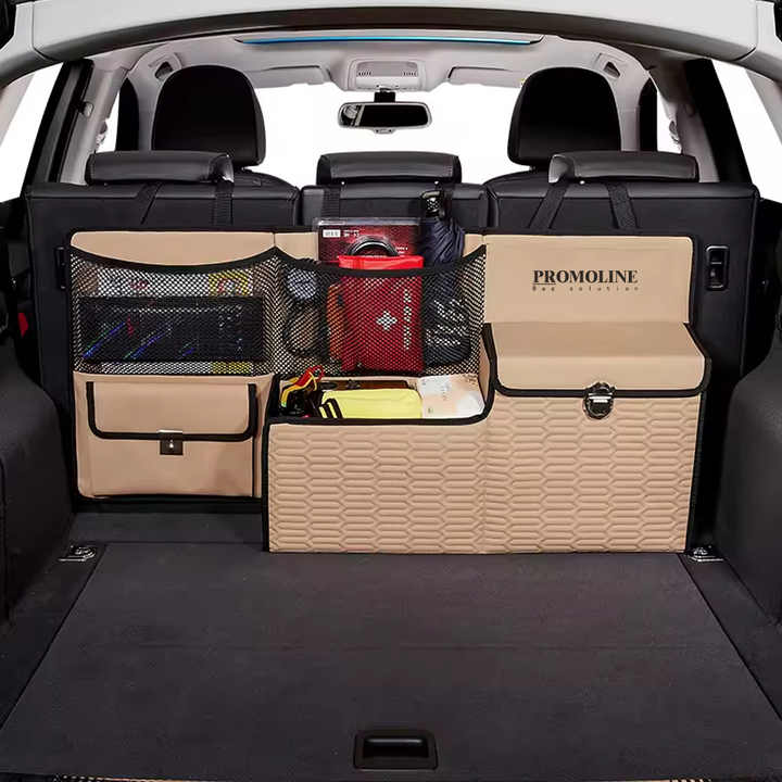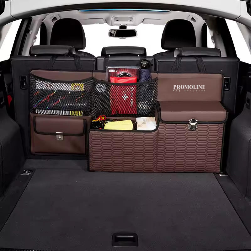 PU Leather Car Trunk Organizer Foldable Hanging Storage Box With Lid and Mesh Pockets for SUV Boot Accessories
