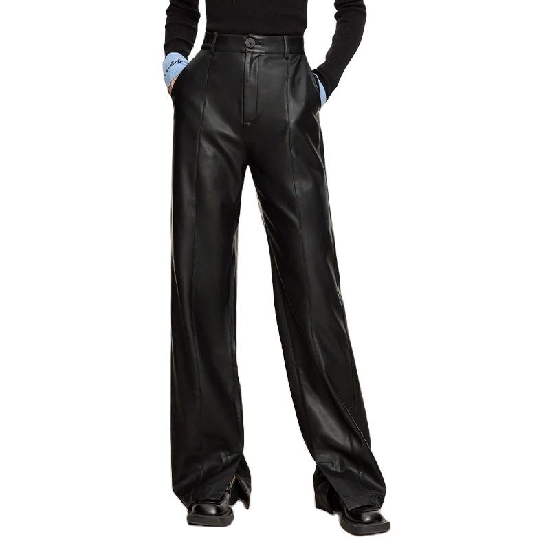 PU Leather Casual Pants for Women 2024 Autumn New Loose Floor Length Straight Slit Female Trousers 12343250