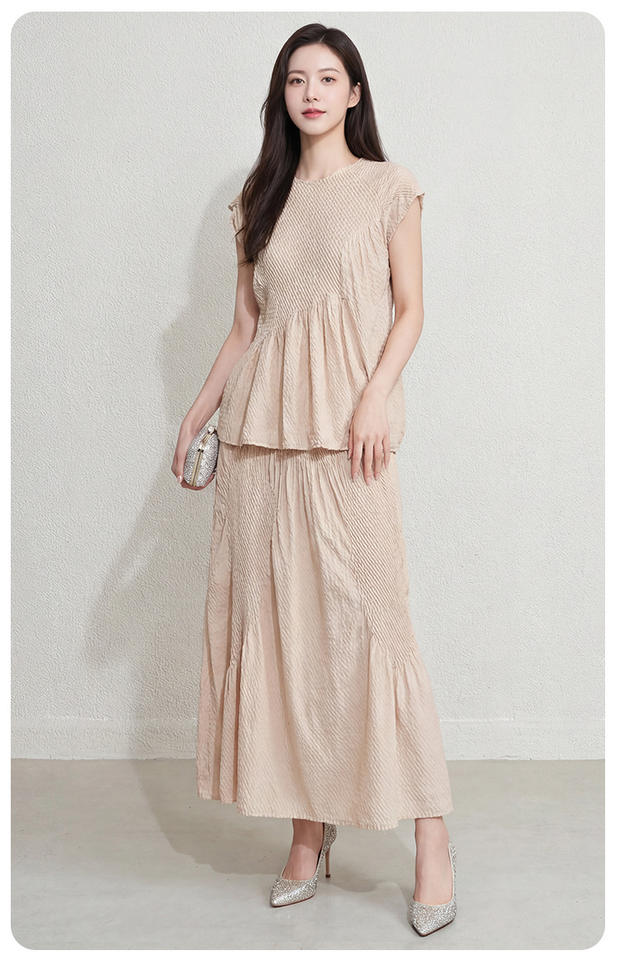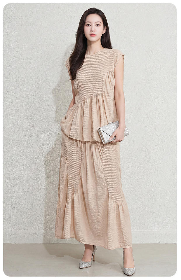 PY Fashion Design Solid Light Khaki Pleated Set Women Sleeveless Top Maxi Skirt Casual Elegant Two-Piece Wholesale Bulk Clothing
