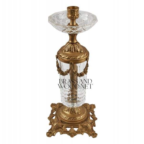 Pair of antique brass and crystal candle holders with engraved artistic details for classic luxury home decor