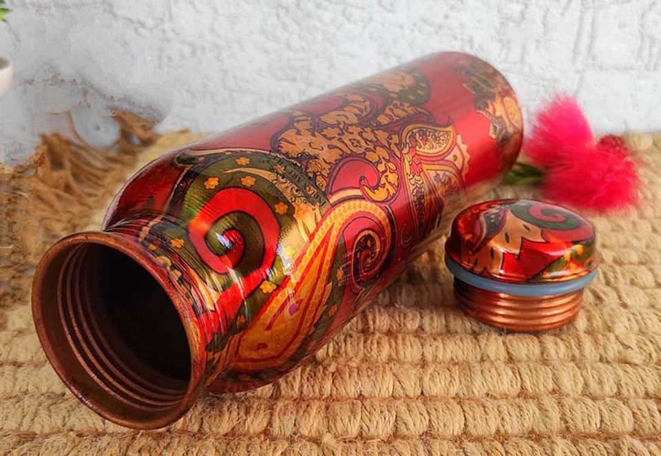 Paisley Design 1 Liter Printed 100% Pure Copper Water Bottle Joint Less Leak-proof Designer Bottles for Home Office Gift