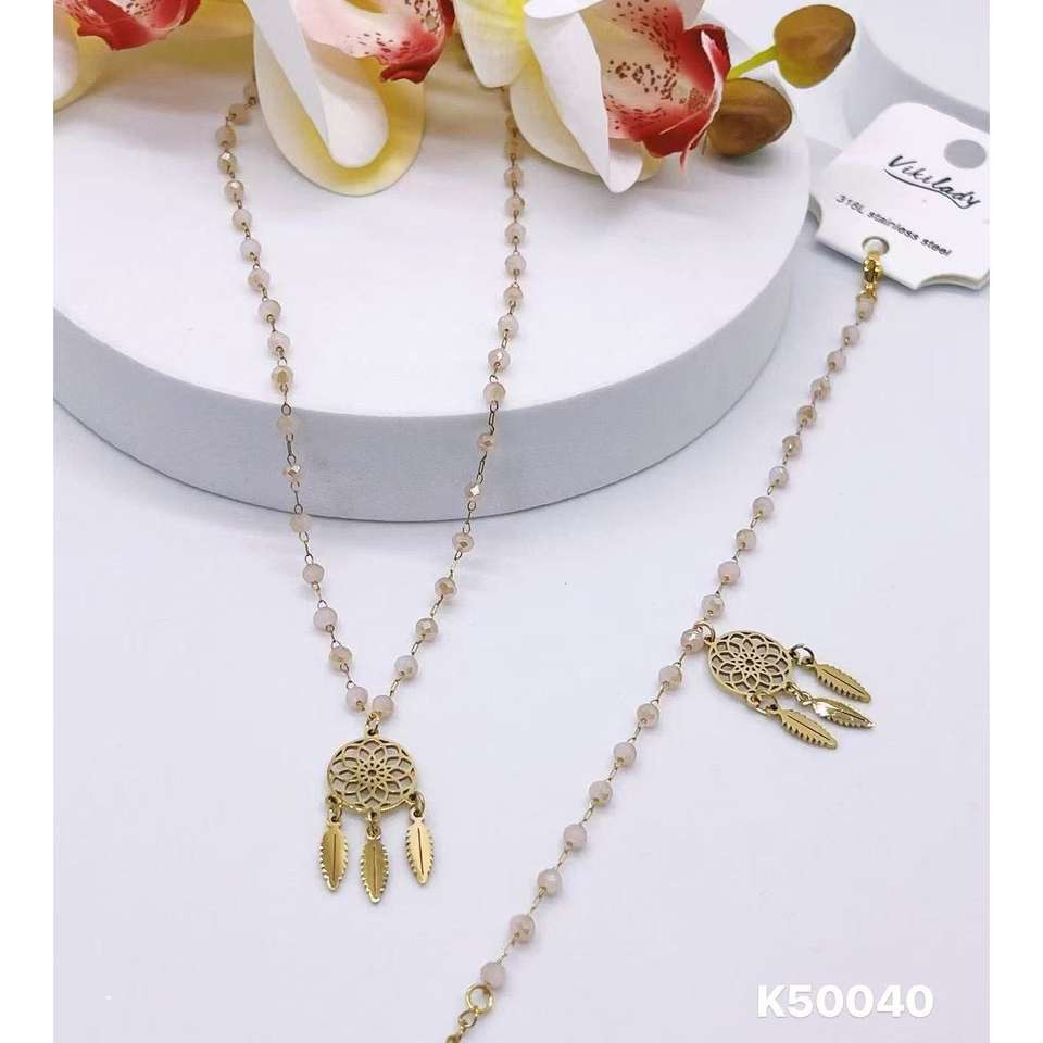 Pale Pink Crystal Bead Dream Catcher Necklace Bracelet Set 316L Stainless Steel 585 Gold Plating Fashion Polish Physical Jewelry