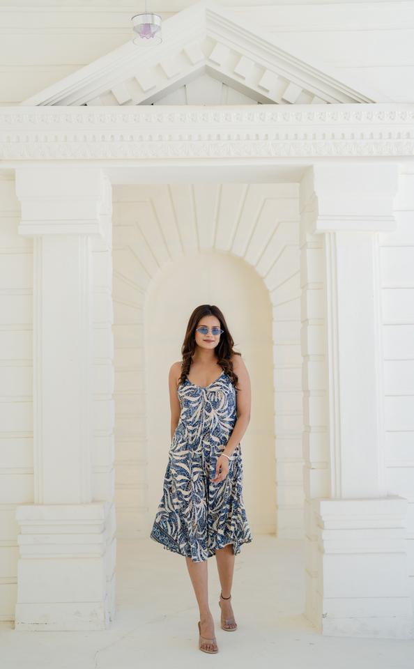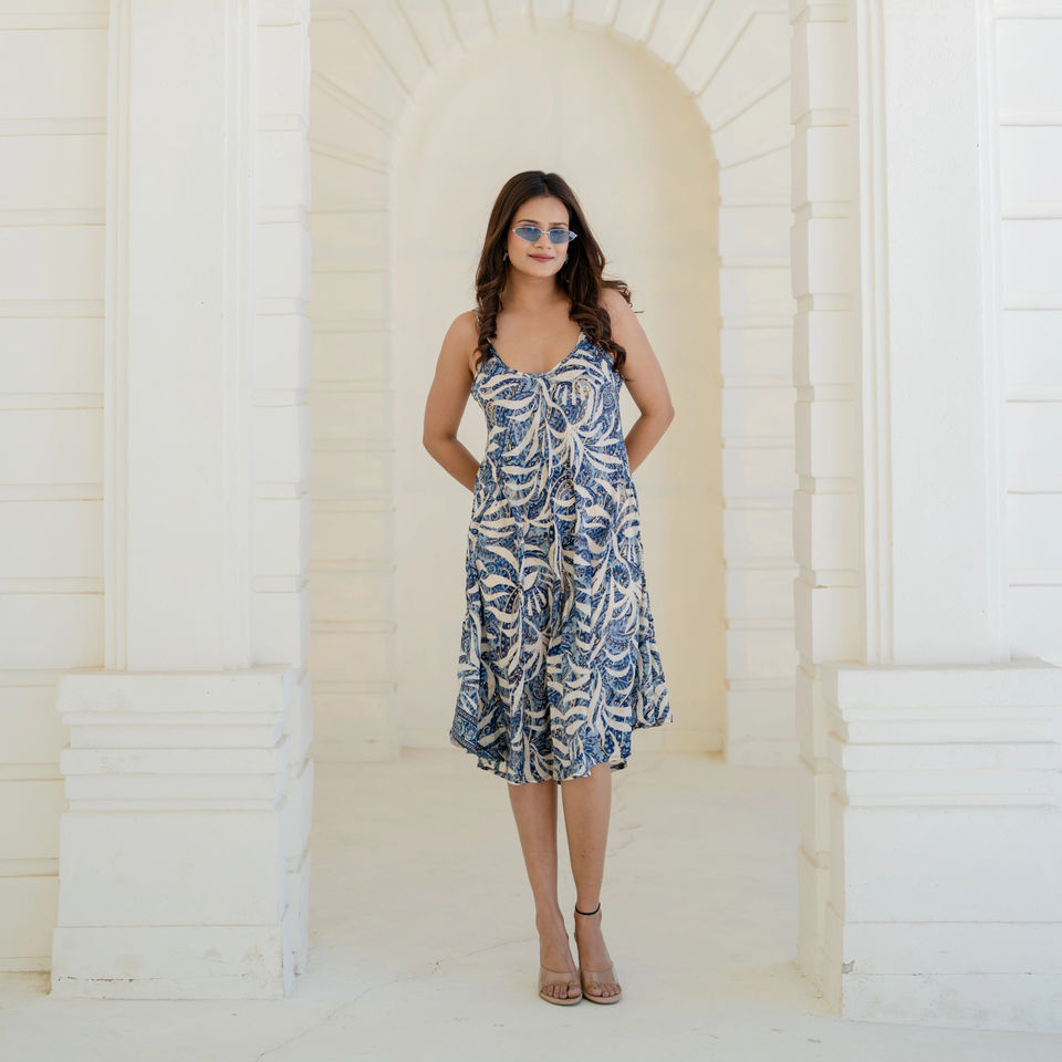 Palm Leaf Print Blue White Summer Midi Dress Tropical Island Vacation Sundress Sleeveless Botanical Pattern Resort Wear Gown