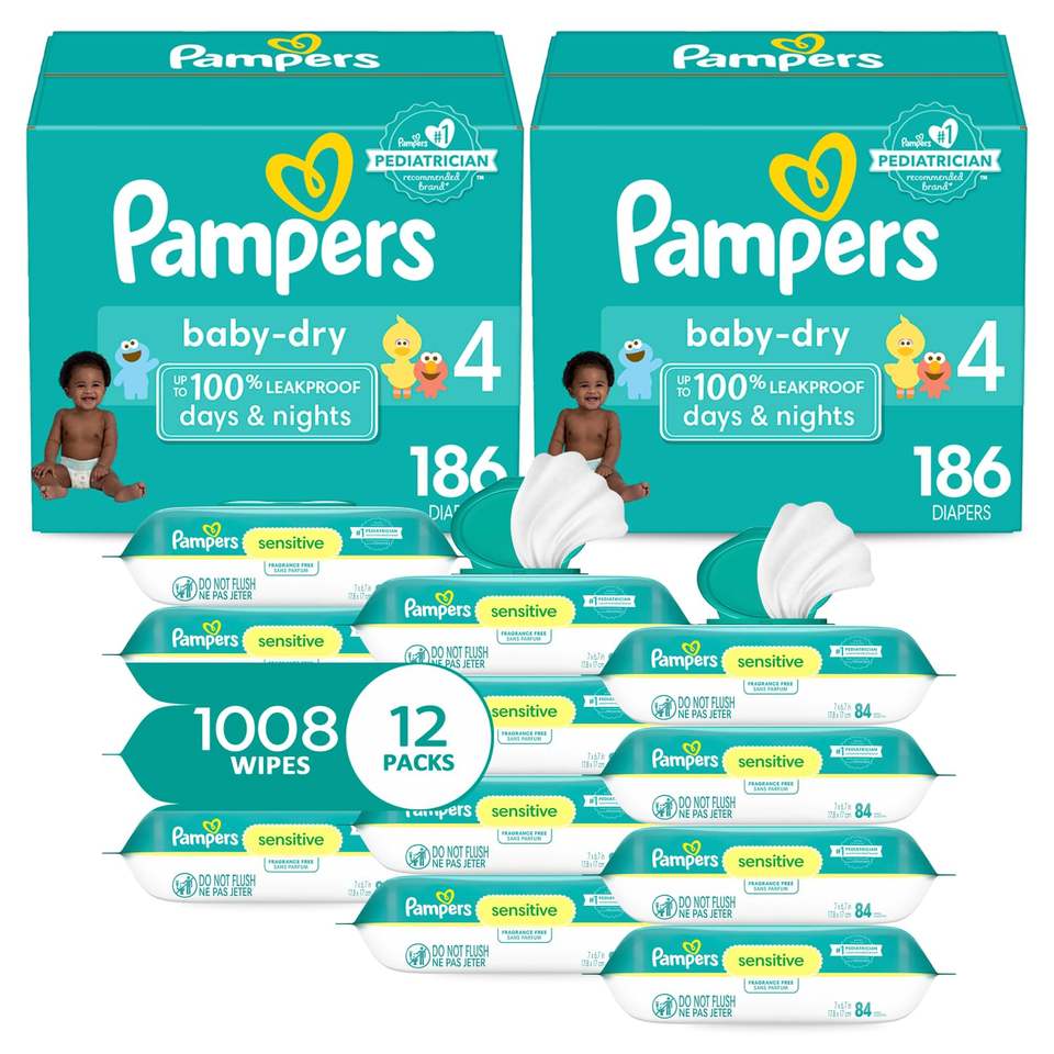 Pampers Baby Dry Disposable Baby Diapers Size 4, 2 Month Supply (2 x 186 Count) with Sensitive Water Based Baby Wipes