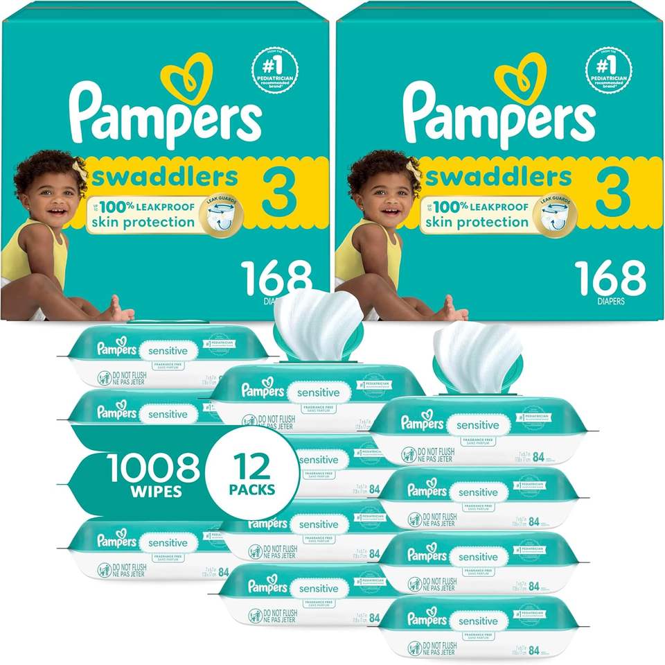 Pampers Pure Protection Disposable Baby Diapers Size 4, 2 Month Supply (2 x 150 Count) with Aqua Pure Sensitive Baby Wipes