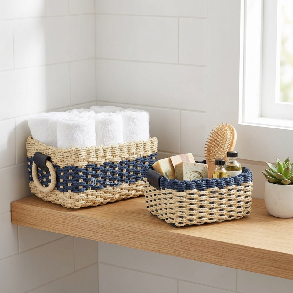 Paper Rope Storage Basket, Woven Rectangle Organizer with Ring Handles, Two-tone Nautical Eco-friendly Bathroom & Closet Bin