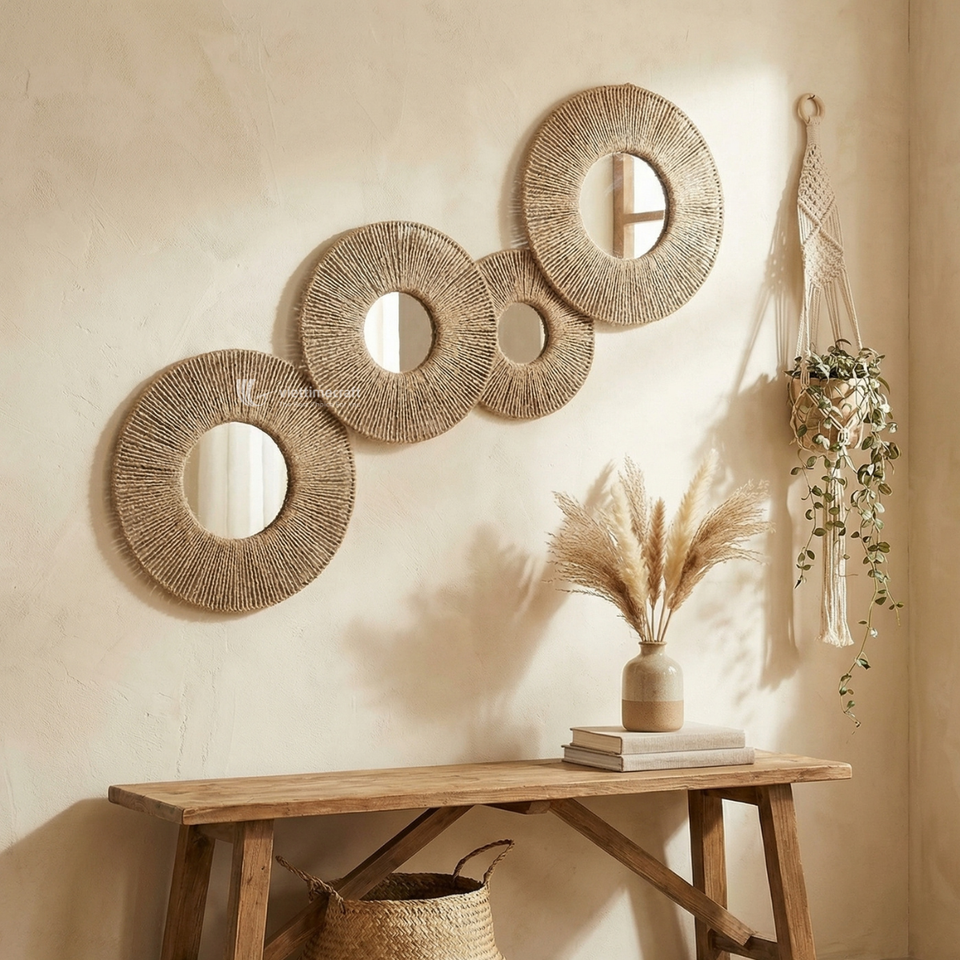 Paper Rope Wall Mirror Set, Boho Chic Sunburst Wall Art for Bedroom, Living Room & Entryway, Eco-friendly Natural Fiber Decor