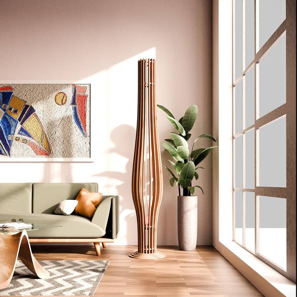 Parametric Floor Lamp Laser Cut Ready Art Decor Wavy Wooden Lamp E27 Yellow Shade Gift for Friend's New Home