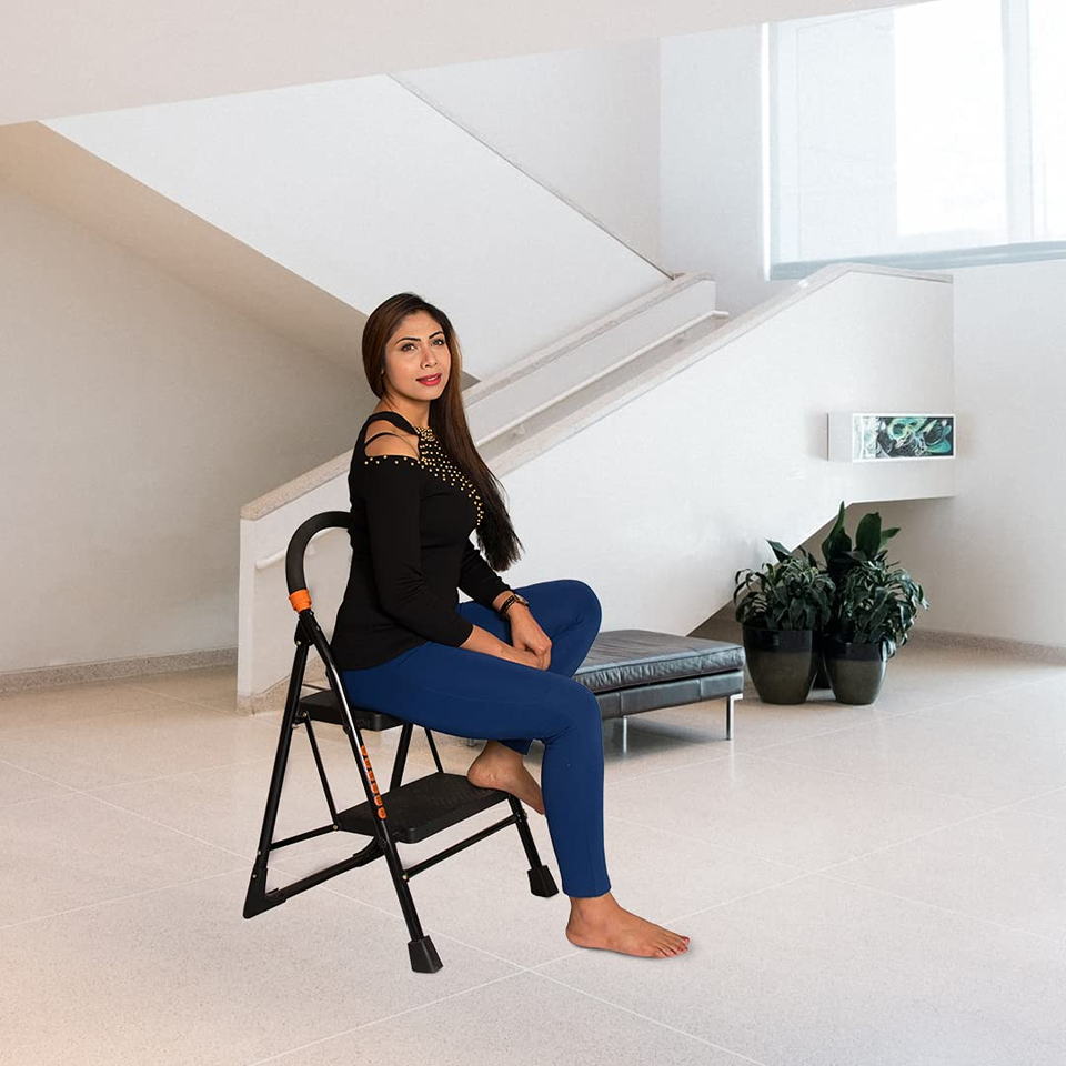 Parasnath 2 Step Orange Diamond Mild Steel Foldable Ladder for Home - Wide Anti-Skid Plastic Steps for Extra Gripping