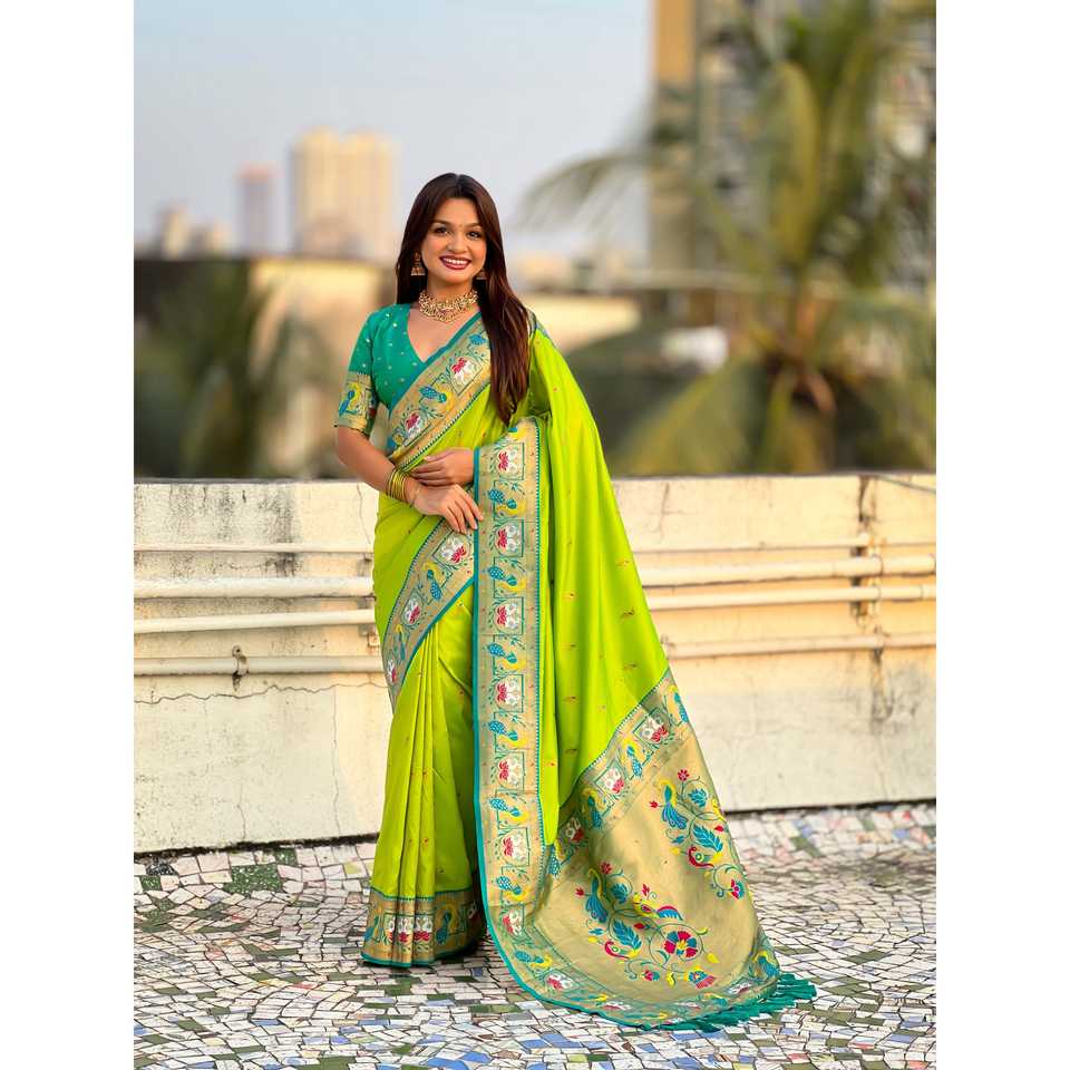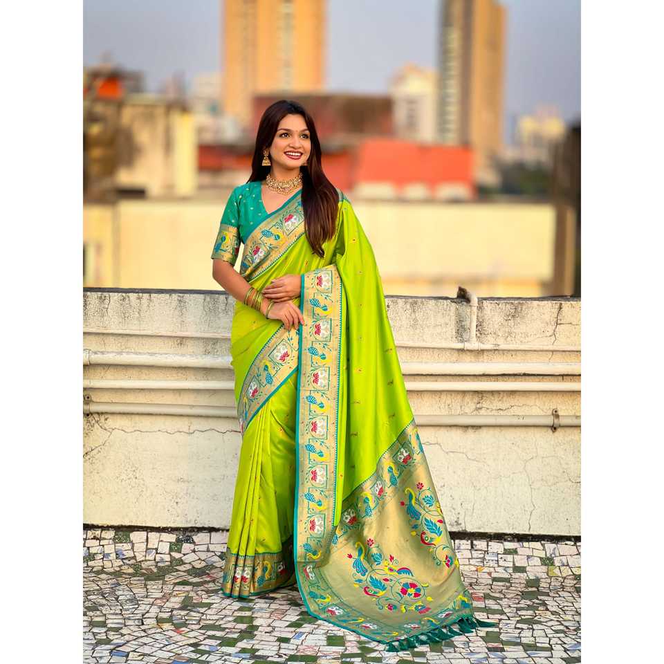 Parrot Green Soft Silk Swan Rajhans Paithani Saree Traditional Scarves & Shawls