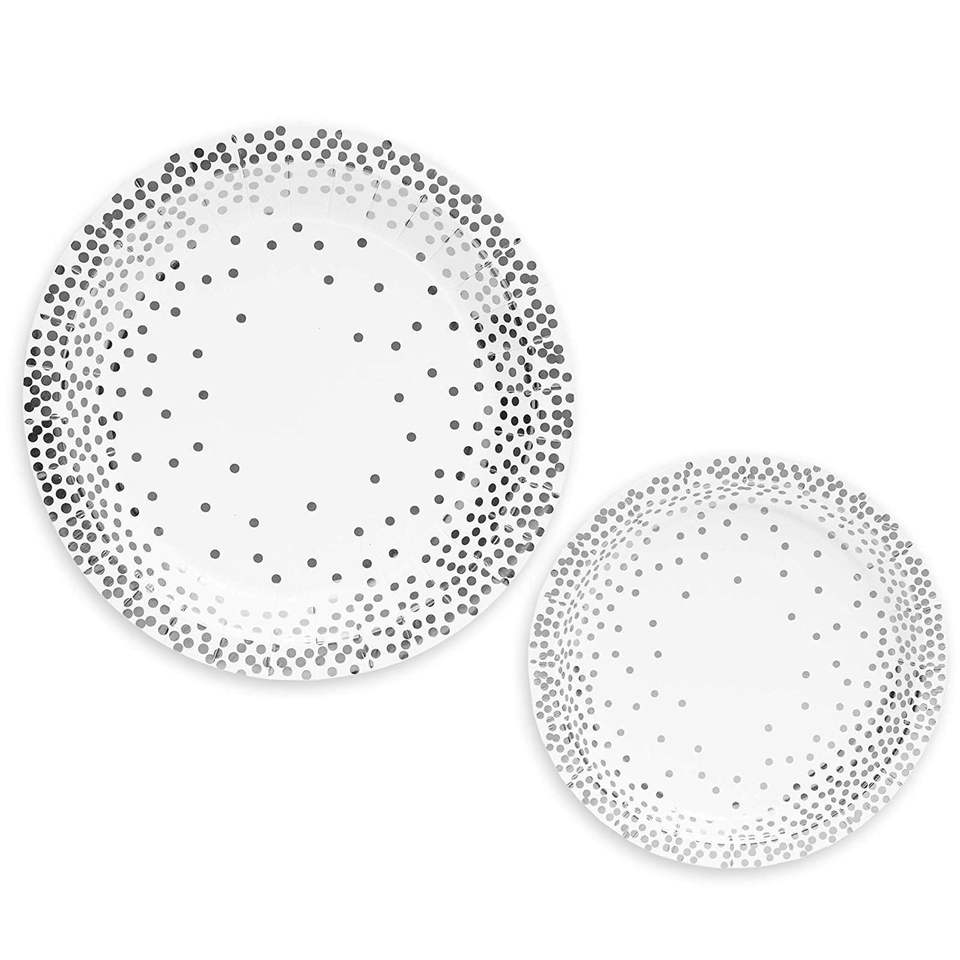 Modern 50-Pack Party Supplies Silver Foil Polka Dots 9'' Plates 7'' Plate 9oz Cups-for Stylish Parties