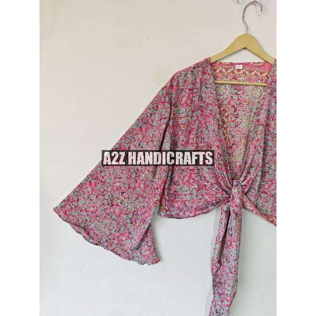 Most Trending Women's Floral Dot Crop Top Summer Wear Casual Silk Wrap Tie Blouse Deep V Long Bell Sleeves Party Wear Top
