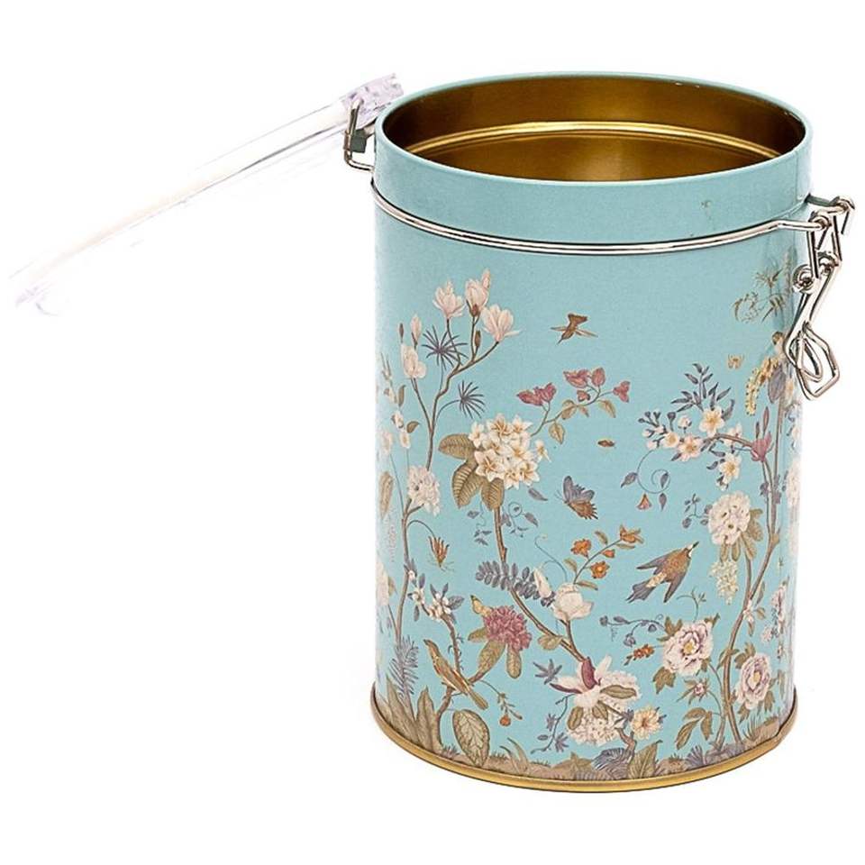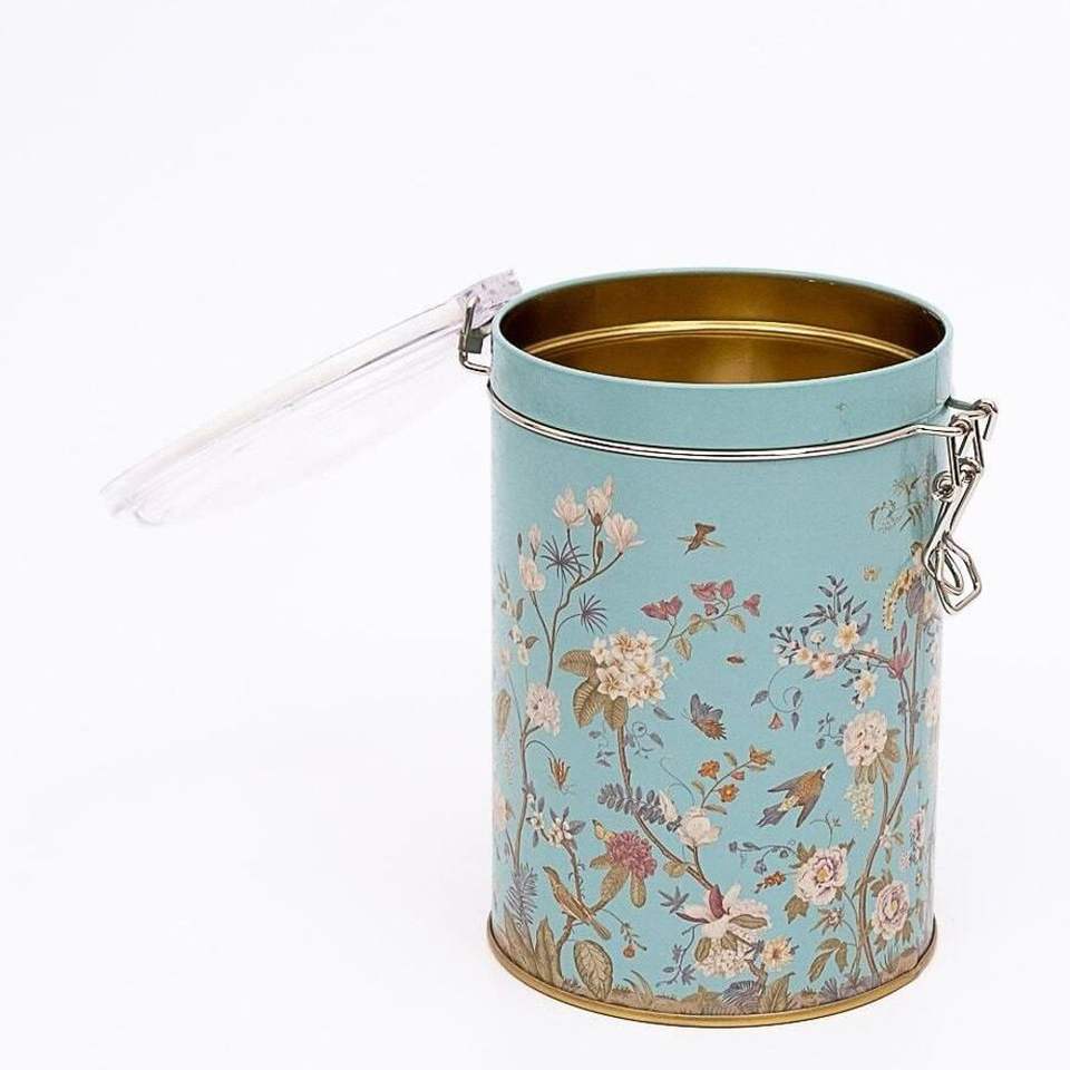 Pastel Blue Floral Design 1.1L Metal Food Storage Container Ø105x150mm round with Wire Clasp and Transparent Lid