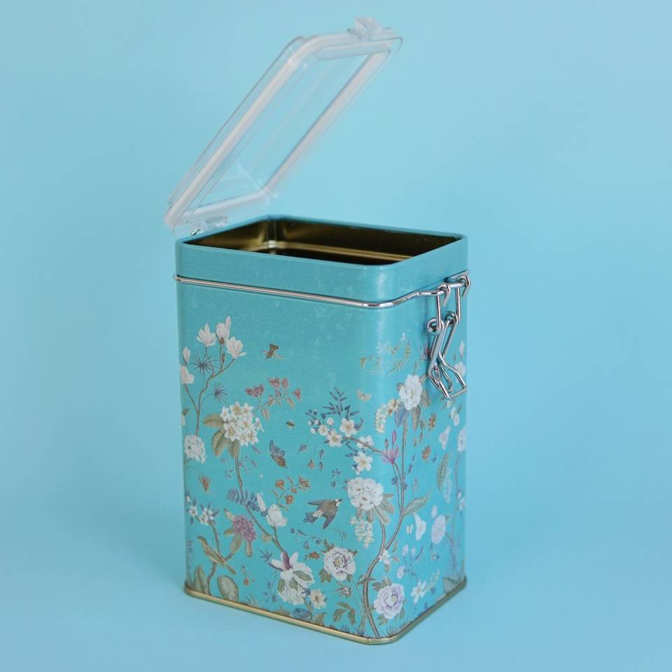 Pastel Blue Floral Design 75x100x150mm Metal Storage Tin with Wire Clasp and Transparent Lid for Crafts and Art Supplies